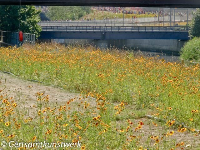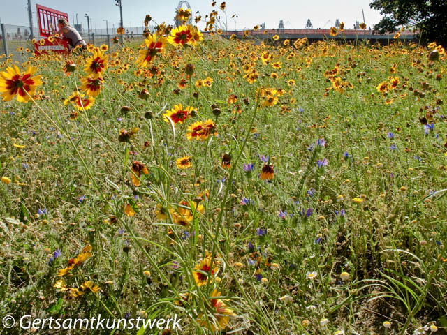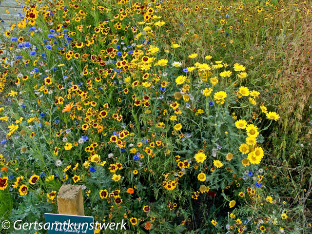 What struck me most was the amount of space. I had visions of shuffling uncomfortably in crowds all day but that didn't happen. It was very quiet when we first arrived, most people being in events, especially in the 80,000-capacity Athletics stadium and the 17,500-capacity Aquatics Centre. We wandered freely around the park, going up to almost the Northern reaches, looking at the various venues, and spending some time in the wetlands. I was impressed by how the land was managed, not just sports venues amidst concrete, but lots of gardens. The park had been planted with wildflowers. Up until then I hadn't given much thought to wildflowers, but since then I have noticed more and more areas being planted or left for wildflowers to flourish. (I know there is a question about whether 'wild' flowers can be 'planted' but I think we all know what we mean by 'wildflowers').