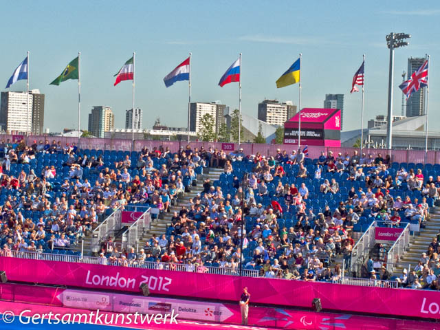 We didn't book tickets for the Olympics. A whole host of reasons and I don't particularly regret not doing so. I watched so much on TV, and bitten by curiosity, we did book tickets to the Paralympics. We left it late, so there was limited availability for our chosen day. We booked tickets for the semi-final of the Seven Aside football, at the Riverbank Arena, which hosted the hockey during the Olympics. This gave us access to Olympic Park for the day, and, if we had wished, we could have chosen to queue for admission to some of the other venues.