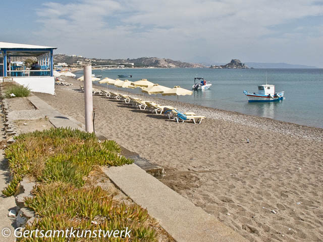 We drove across the island to a beach town for lunch. Kos is said to be one of the greenest Greek islands. I've previously been to Corfu and Crete, but the scenery just doesn't grab me. The town we stopped in - whose name I forget, I didn't make contemporaneous notes - had an air of end-of-season. A few people sunbathing on the beach but not much else. Even the tourist train was parked up and seemed out of commission.