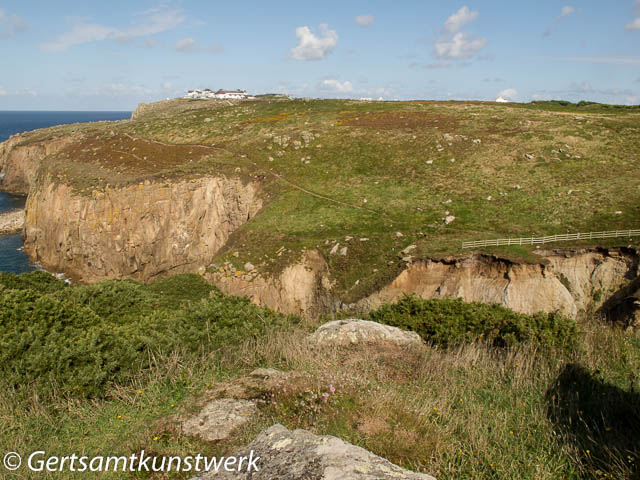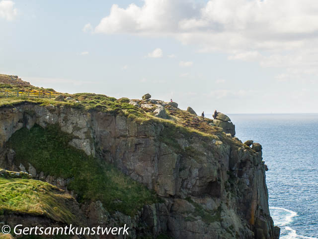 We walked back towards the car park. He told me that he had been looking at people's footwear. So had I. People with stout shoes headed out purposefully along the cliffs. People in shoes intended for mooching shopping malls looked confused. We saw a coach unload its human cargo. Most were in flip-flops, some in new shiny trainers, bought especially for their trip to the country. They took photos of each other posing in front of the sea. From the edges of the car park, it could have been any sea, nothing would say 'Land's End'.
