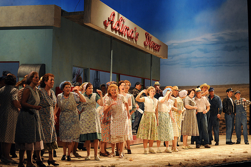 The set was a movable box, depicting Adina's Diner. For different scenes it alternated between right angles, sometimes showing the inside of the diner, sometimes the front view, with a rickety sofa in front, and a couple of petrol pumps, and a drive on part for a splendid 1950s YankTank of a car.