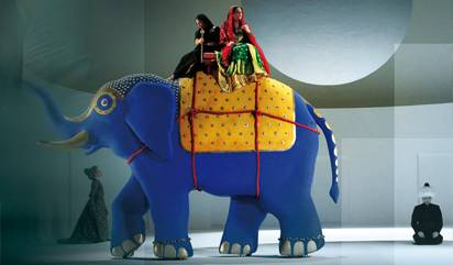 Other than the blue elephants, the most striking use of colour was when Tamerlano appeared in a bright fuschia pink outfit together with pink stiletto ankle boots. I particularly remember this because at one stage, Bajazet was lying down and Tamerlano put his/her stilettoed foot on his back, and it stuck me as being a bit, well, you know...