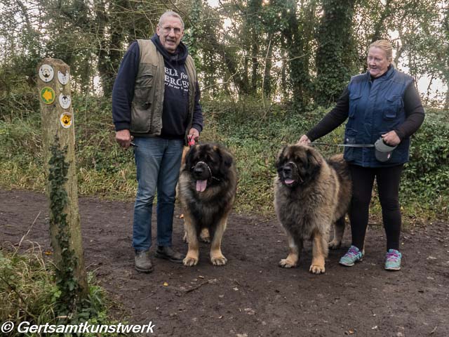 As I descended, I was simultaneously fiddling with something in my handbag, watching my feet on a slippy muddy path and holding my handbag. I looked up and saw that the Wild Animal Park were exercising their lions on the canal bank...no, that can't be right, they wouldn't take Big Cats onto a public footpath, not during school holidays. These are in fact Leonberger dogs!