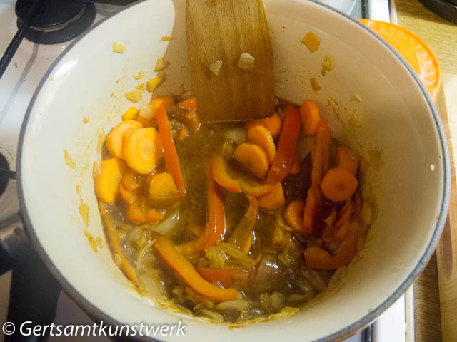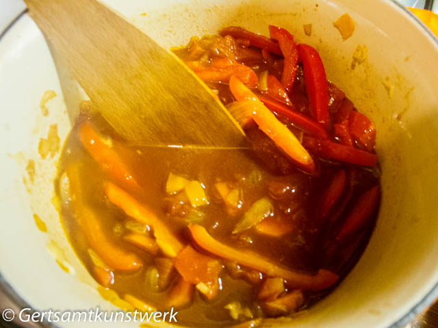 Saute onions and garlic, add stock, carrots, peppers, chillis, and reduce it down.