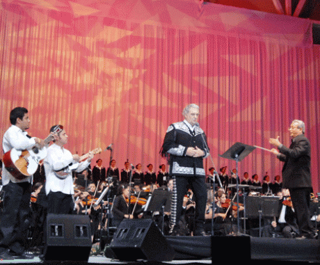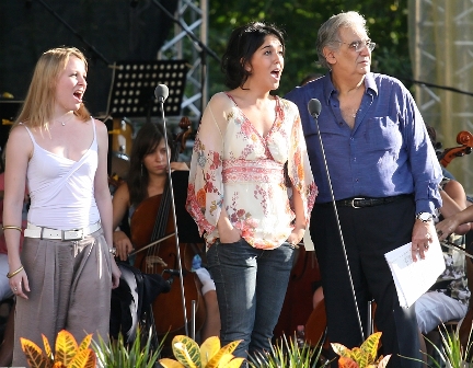 Domingo, dressed in colorful Turkish robes (did he insist?) as the